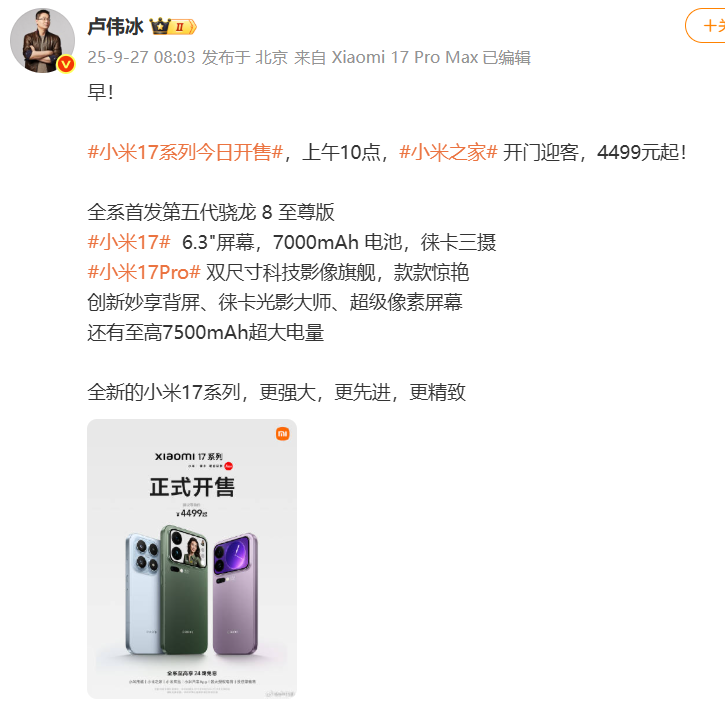 9月27日上午10点,小米17系列开售,价格4499元起!并全系首发第五代骁龙 8 至尊版。据悉,小米17尺寸6.3,7000mAh 电池,并配备徕卡三摄,小米17Pro双尺寸科技影像旗舰最好股票配资,创新妙享背屏、徕卡光影大师、超级像素屏幕,还有至高7500mAh超大电量。
