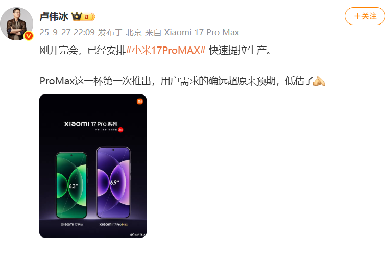 9月27日晚,卢伟冰再发微博表示:已经安排小米17ProMAX 快速提拉生产。ProMax这一杯第一次推出,用户需求的确远超原来预期,低估了 。